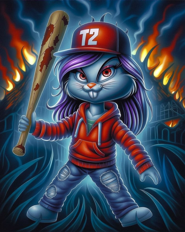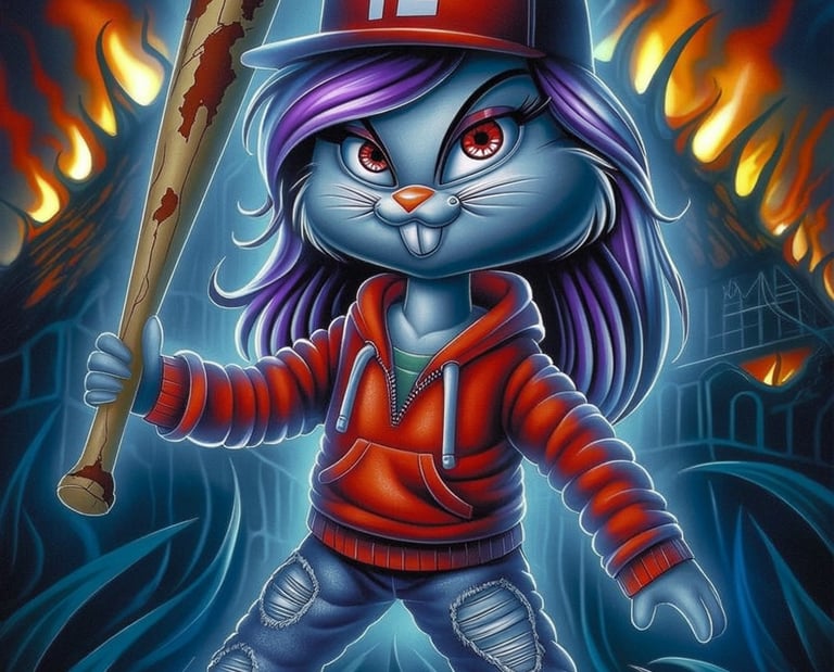 Une femme animée au regard mystérieux et aux cheveux bleus éclatants, baignée dans une ambiance à la fois magique et futuriste